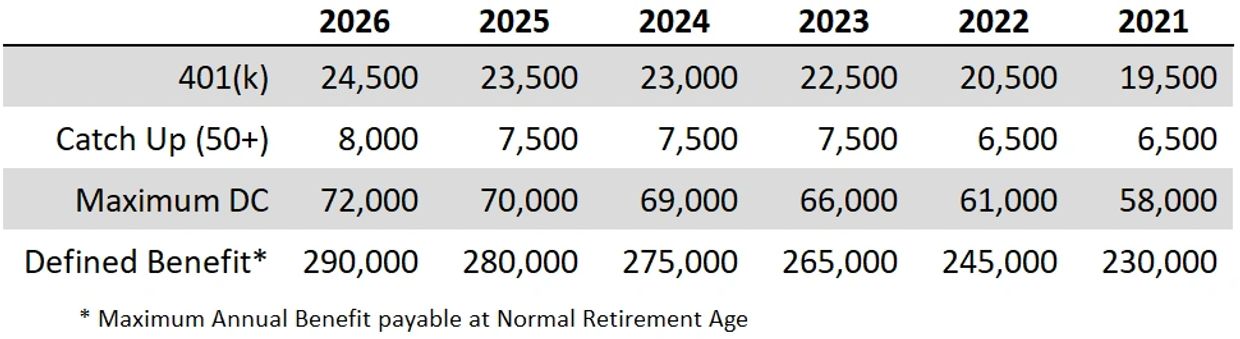 Defined Benefit Plans — such as traditional pension or cash balance plans — are instead limited by the maximum annual benefit payable at normal retirement age, as defined under IRC §415(b). For 2025, the maximum annual benefit is $280,000, typically expressed as a life annuity beginning at age 62–65.