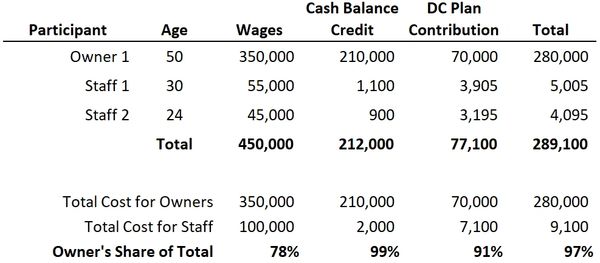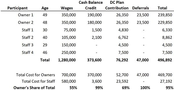 This design was completed for an owner and his two staff employees. We were able to maximize the owner with a $210k CB credit and the $70k DC maximum allowable contribution. The fact that he had a younger employee allowed this plan design to pass non-discrimination testing.